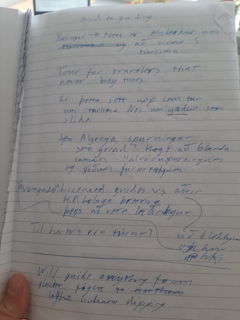 Tveir hlutir smullu saman og búmm, ég vissi að ég ætlaði að skrifa Guide to Guiding. Það var eins og rafmagn færi um mig allan, ég sá fyrir mér sviðið og efnistökin. Ég held meira að segja að mér hafi dottið titillinn í hug á leiðinni í bílinn. Reyndar var fyrsti titilinn sem ég íhugaði Guide to Iceland, en áhugi minn að keppa við stórfyrirtæki um Google pláss er nákvæmlega engin, fyrir utan að ég hafði ekki áhuga á að fá bréf sem í stóð: Þú ert að nota vörumerkið okkar, vinsamlegast hættu því eða…